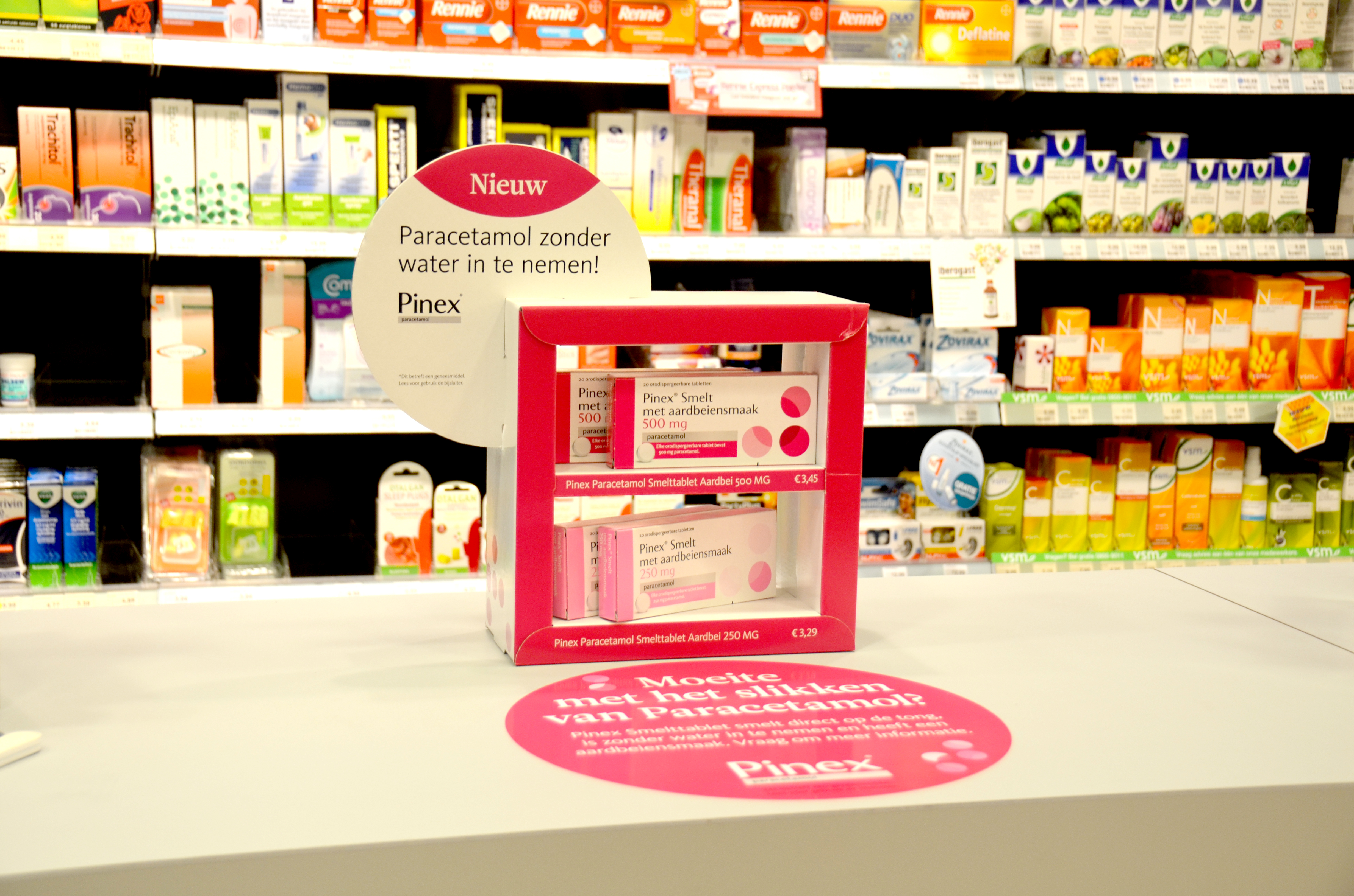 Ken je Pinex Smelt met aardbeiensmaak al? Dit is een bijzonder geneesmiddel van Aurobindo, maar hoe vertel je klanten nou dat deze paracetamol ideaal is voor iedereen die moeite heeft met het doorslikken van pillen? Met behulp van een kassadisplay!
